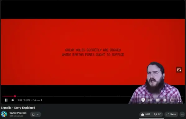 К тому, я ловлю себя на всяких несуразных мыслях. Например, я раз пятнадцать пересмотрела видео с анализом игры SIGNALIS. (См. скриншот. Оно, кстати, идёт почти восемь часов.) На одном из недавних просмотров я себя поймала на серьёзных, подробных раздумьях о том, какого было бы жить с автором канала в браке. Это безобидный случай. О небезобидных я лучше говорить не буду.