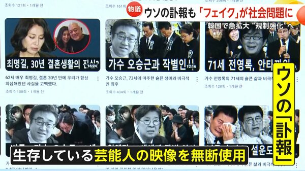 韓国で、人気観光地でアザラシが泳ぐ動画や芸能人のウソの訃報がYouTubeで拡散されるなど、フェイクニュースが社会問題となっている。李在明大統領は、「懲罰的な賠償」での対策を検討するように指示した。専門家は、規制強化の背景には、過激なYouTuberの行動を抑制する狙いがあると指摘した。韓国で今、フェイクニュースが社会問題となっている。冠水した町で猫が泳ぐ様子や水に飛び込む女性を映した動画や、韓国の国家遺産として知られるソウルの人気観光地「景福宮」で、黄色いレインコートを着た男性の横でアザラシが泳いでいる動画もあった。これらは、全てAIが作ったフェイク動画だ。さらに、こんなフェイクニュースも作られている。取材班:こちらのYouTubeチャンネルでは、韓国の芸能人のニセの訃報ニュースが多数投稿されています。実際には生存している芸能人の映像を無許可で使い、ウソの訃報として伝えていた。中には「とても悲しいです…。俳優キム・ヘスクが70歳で死去」と、日本でも大ヒットしたドラマ「冬のソナタ」でチェ・ジウさんの母親役を演じた大物俳優のウソの訃報も投稿されていた。韓国で問題となっているフェイク動画は、2025年6月に行われた大統領選の最中にもあった。檻の中に入れられた尹錫悦前大統領を李在明大統領が笑いものにする動画など、フェイク動画がSNSなどで急速に広がった。李在明大統領:フェイクニュースでお金を稼ぐことがあまりにも多いが、フェイクニュースをばらまくYouTuberたちをどうするか、法務省は検討するように。一番良いのは懲罰的賠償である。規制強化に動いた背景の一つとして、専門家は次のように分析している。龍谷大学・李相哲教授:今のところ李在明大統領が激怒したきっかけは、自分の少年工時代のことに関して、フェイクニュースを流していることだと私は思う。これは、李在明大統領の少年時代に関するフェイクニュースを伝える動画だ。ナレーション:皆さん、米国モース・タン大使の暴露で、李在明の少年犯罪関与疑惑が再び話題になっています。フェイク動画では大統領が少年時代に罪をおこし、進学できなかったといった虚偽内容を発信していた。さらに、規制強化の背景には過激なYouTuberへの対策もあった。取材班:弾劾賛成派の集会の前に、保守系のYouTuberが座り込んで邪魔をしています。2025年3月、当時の尹大統領への弾劾に賛成する集会に、対立していた李在明氏を批判する、いわゆる保守系のYouTuberが乱入した。弾劾賛成派:尹錫悦を逮捕せよ!逮捕せよ!保守系YouTuber:李在明を逮捕せよ!逮捕せよ!専門家は、懲罰的な損害賠償を科すことで過激なYouTuberの行動を抑制する狙いがあると指摘した。龍谷大学・李相哲教授:YouTubeは大きな産業の一つになっていて、YouTubeの影響力は無視できない。韓国で社会問題化しているフェイク問題の有効な対策が急がれる。(「イット!」8月6日放送より)