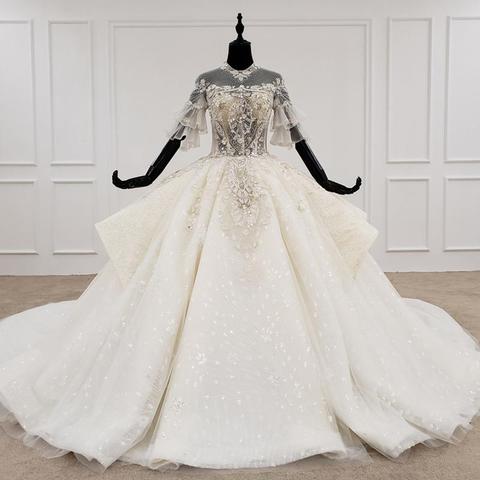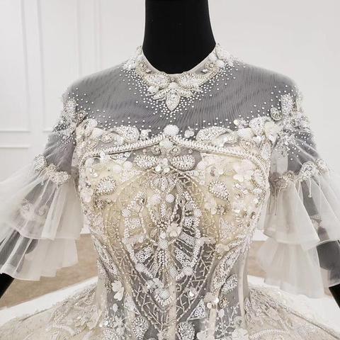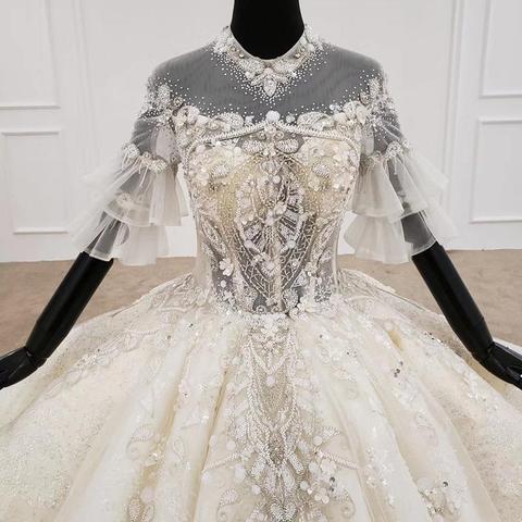 Aライン 高級感ある前撮り衣装 ウェディングドレス ビーズ付きハイネックドレス