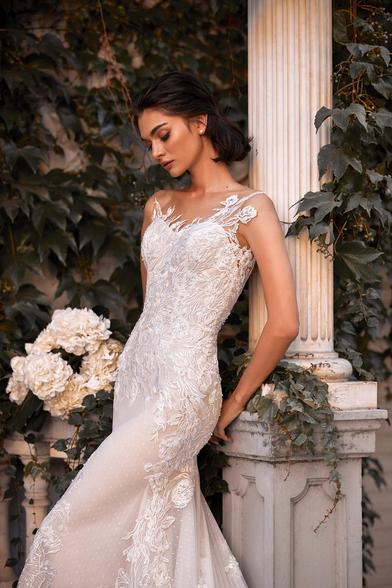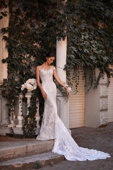 マーメイドライン ケープ付きのウェディングドレス レースアップリケの花嫁衣装