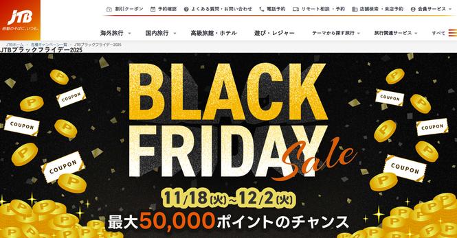 JTBは、国内・海外旅行がお得な「JTBブラックフライデー」を全国店舗・公式Webサイトで開始した。開催期間は11月18日〜12月2日。