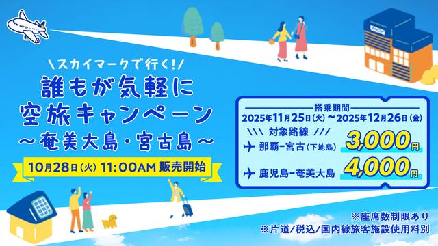 スカイマークは、「誰もが気軽に空旅キャンペーン~奄美大島・宮古島~」を10月28日11時~11月30日に実施する。
