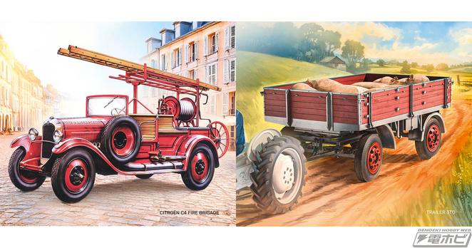 戦前のフランス車「シトロエン C4」を消防車に改装したモデルと、1940年頃に生まれたオーソドックスな3トントレーラーの1/24スケールキットがエレールから登場! | 電撃ホビーウェブ