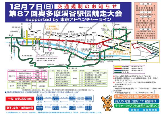 東京都青梅市は、12月7日の「第87回奥多摩渓谷駅伝競走大会」開催に伴い、青梅市役所前から奥多摩駅の区間で交通規制を実施する。