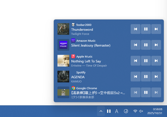 動画や音楽の再生を、タスクトレイ上から制御できるようにするソフト「MediaFlyout」