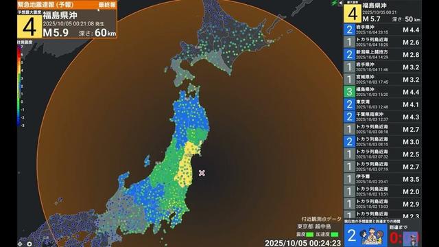 【地震】震度4 M5.7 深さ50km 2025年10月5日00時21分 福島県沖 #