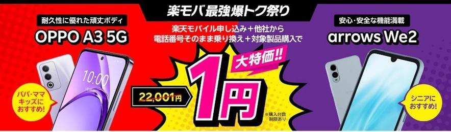 楽天モバイルへ乗り換えで人気スマホのarrowsWe2、OPPO A3 5Gが1円で買えるキャンペーン中✨
