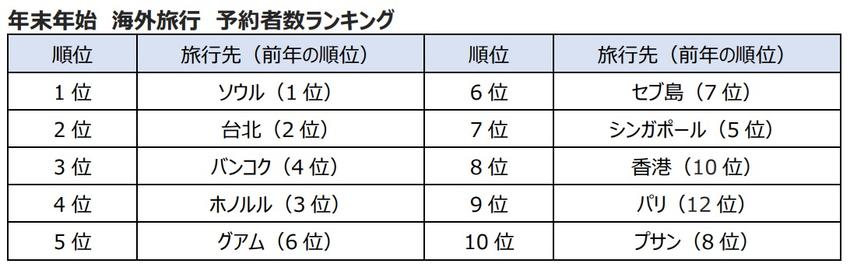 1位ソウル、2位台北、3位バンコク、グアムも急上昇。HIS、年末年始の海外旅行予約動向を発表
