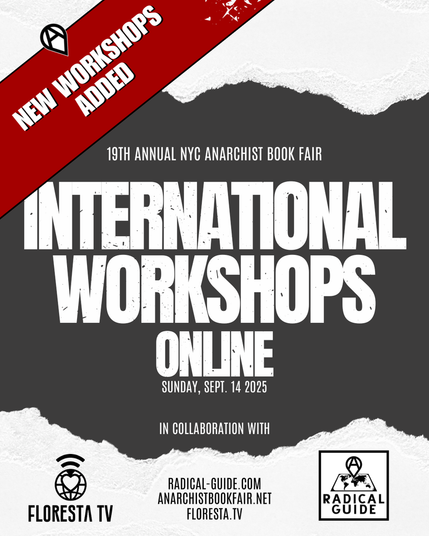 New workshops have been added to the NYC Anarchist Book Fair International Workshops, organized with Floresta TV and A Radical Guide. These sessions bring together organizers and communities across borders to share practices of resistance, mutual aid, and liberation.
