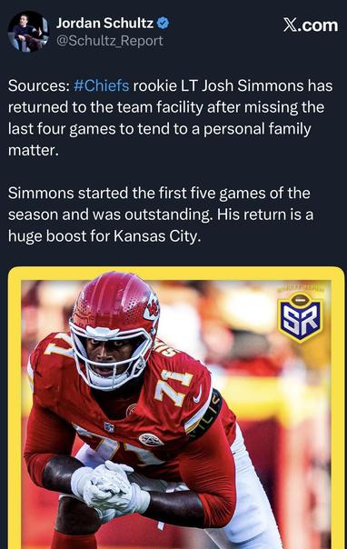 [@Schultz_report on X] Josh Simmons has returned to the Chiefs team facility. - Raw Chili