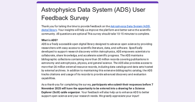 Thank you for taking the time to provide feedback on the Astrophysics Data System (ADS) digital library. Your insights will help us improve the platform and better serve the scientific community. All questions are optional This survey should take 10-15 minutes to complete.