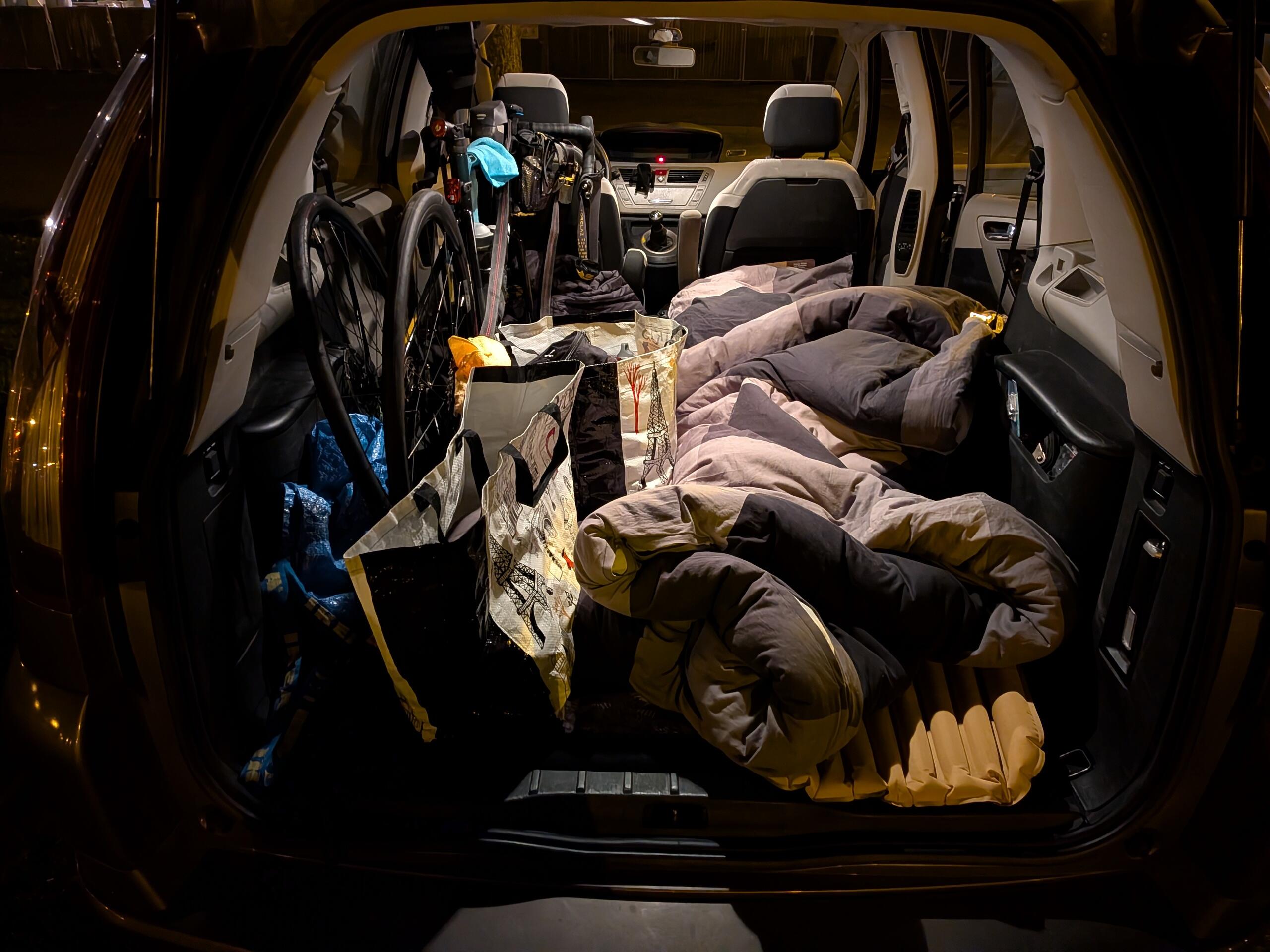 Couché vers 23h, ce sera une nuit bien au chaud de… 5h. Oui, bon, c’est cours mais cela fait partie aussi de l’entraînement, non ? Réveil, montage de Batty, petit déjeuner sur le bord du coffre.