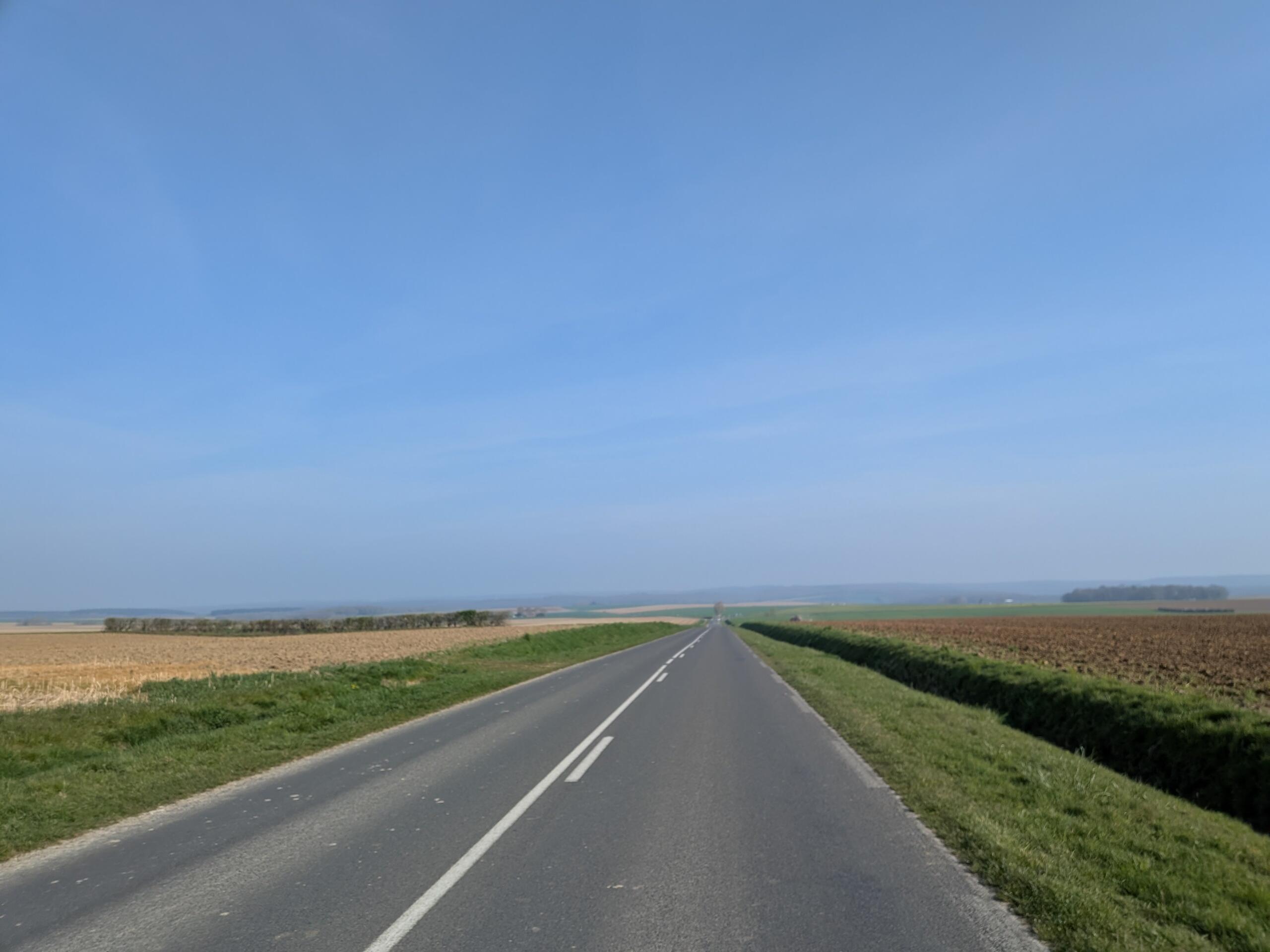 Km100, 4h15 de roulage. Je suis plutôt très content de cette vitesse et fatigue normale. C’est tout à fait plaisant. Juste après, petit côte et je me retrouve tout seul direction nord est face au vent. Aïe. Pendant près de 40km j’ai le vent dans le nez et la moyenne sans ressent. La route n’a pas d’abris et est assez monotone.