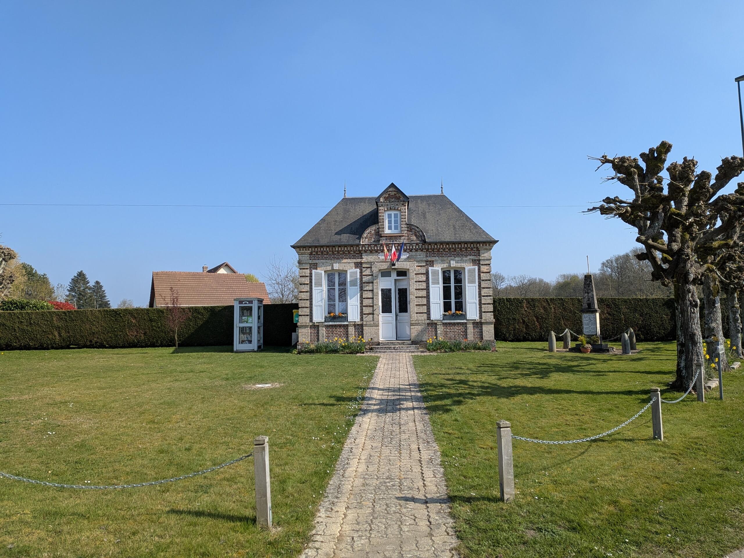 Elle n’est pas trop mignonne cette mairie ? C’est celle de Feuguerolles . La caricature avec la cabine transformée en boîte à livres et la monument aux morts. Moi j’adore !