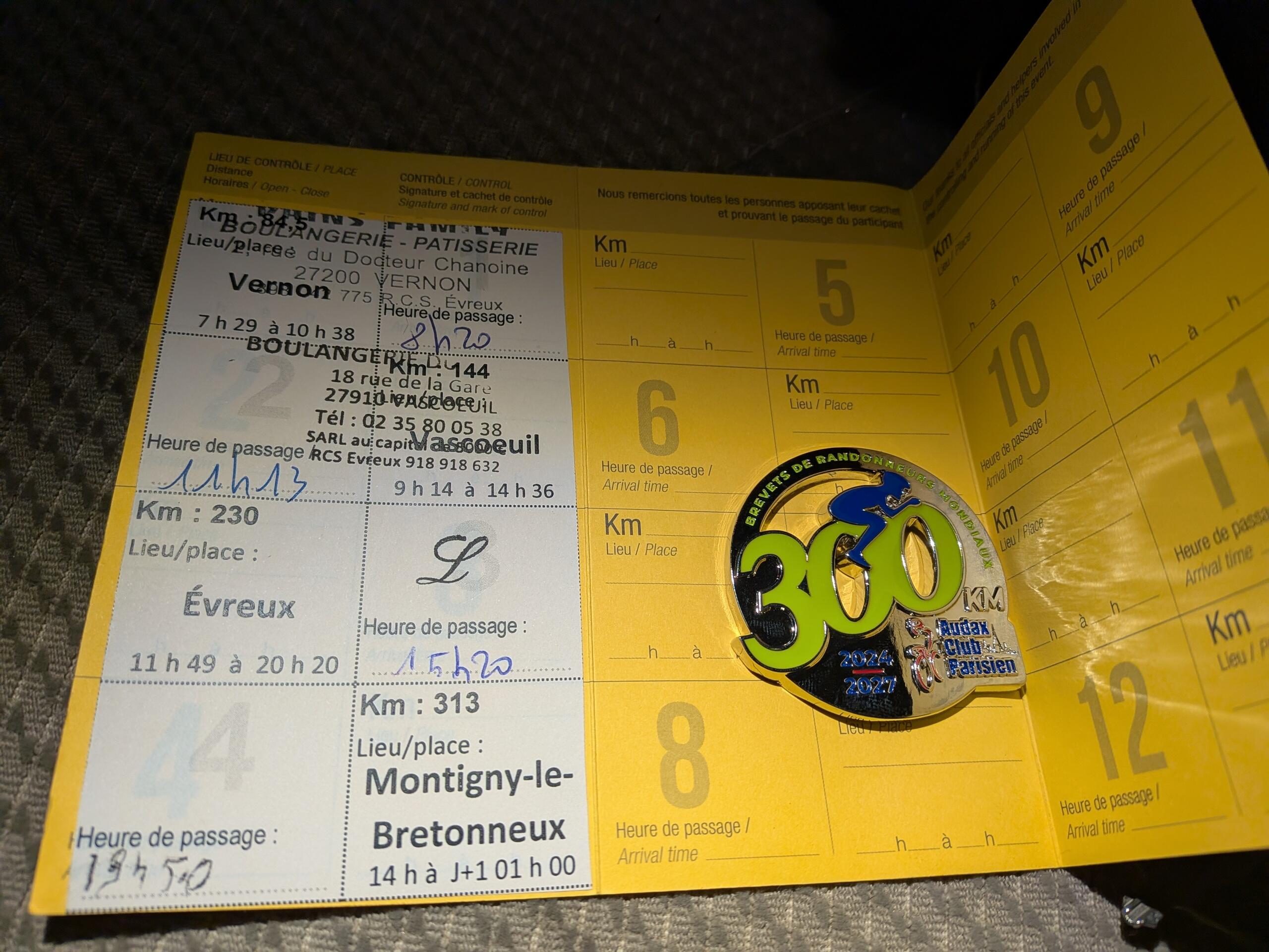 Et enfin voici l’arrivée de mon premier 300km. Temps total 14h50 pour 13h17 de roulage. Je suis chaudement accueilli, de quoi manger et boire, merci à toute l’équipe pour cette organisation.