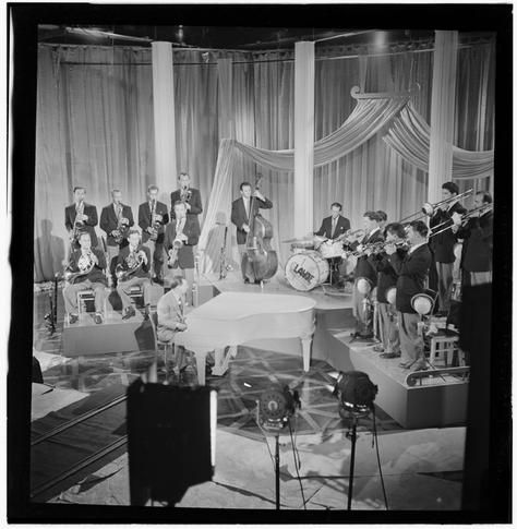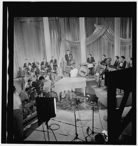 Portrait of Claude Thornhill, Sandy Siegelstien, Willie Wechsler, Micky Folus, Joe Shulman, Billy Exiner, Mario Rullo, Danny Polo, Lee Konitz, Bill Bushing, Emil Terry, Lou Mucci, Eddie Zandy, Barry Galbraith, Bill Barber, Al Langstaff, and Vahe (Tak) Tak