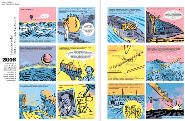 La historieta que Fer Calvi y yo hicimos en homenaje al Impulse Solar, el avión de energía fotovoltaica con el que Bertrand Piccard dio la vuelta al mundo, para la revista de la aerolínea canaria BINTER