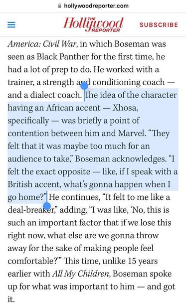 Marvel wanted #BlackPanther's accent to be British or American, but #ChadwickBoseman battled with them for it to be African