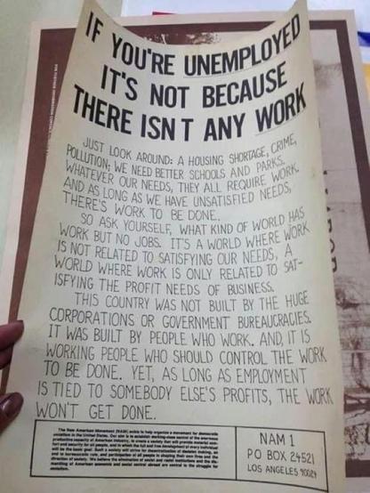 ASK YOURSELF, WHAT KINDS OF A WORLD HAS WORK BUT NO JOBS? IT'S A WORLD WERE WORK IS NOT RELATED TO SATISFYING OUR NEEDS, A WORLD WHERE WORK IS ONLY RELATED TO SAT- ISFYING THE PROFIT NEEDS » »