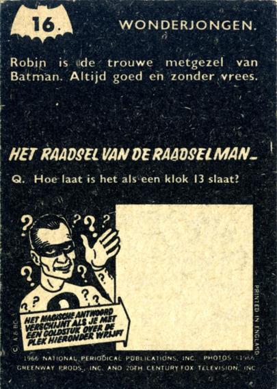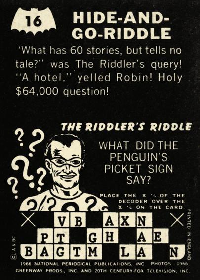 The first cards I remember collecting appeared in shops in 1966. These were The Riddler's Riddle, featuring scenes from the Batman TV series and movie. A delightful set of 38 cards, each with—as the name suggests—a riddle to solve on the back.