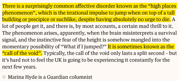 "It is sometimes known as the “call of the void” "(Marina Hyde, The Guardian)