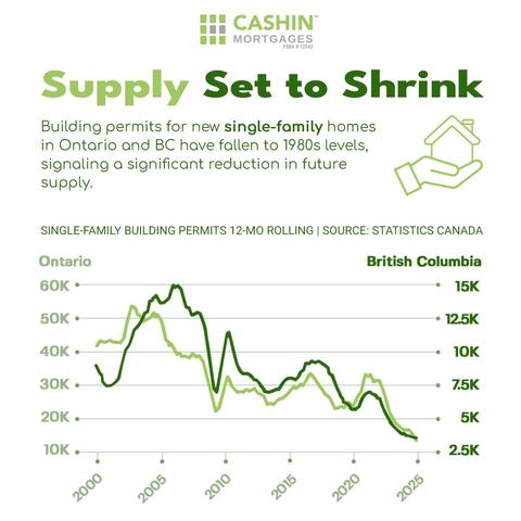 Building permits for new single-family homes in Ontario and BC have dropped to 1980s levels signalling a major reduction in future housing supply.
