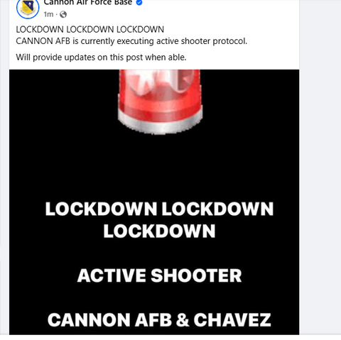 " Cannon Air Force Base deemed ALL CLEAR following reports of Active Shooter CANNON AIR FORCE BASE, N.M. — Around 12:07 p.m., Cannon Air Force Base Security Forces received reports of an active shooter on base. Base leadership takes these reports seriously, and as such, security forces immediately initiated active shooter protocol. Active shooter protocol involves a base lockdown, seeking shelter immediately, and securing facilities. Additionally, no movement is allowed on or off base. Cannon AFB Security Forces secured the area of concern and conducted sweeps across base. There are no reported injuries nor are there any suspects. Cannon AFB has been deemed all clear as of 1:03 p.m. "
