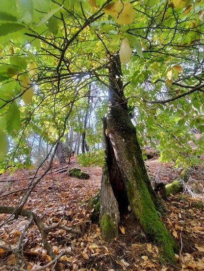 Bajo las hojas de un castaño, comenzando a tornarse de Otoño.
