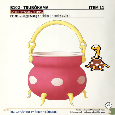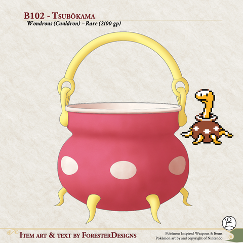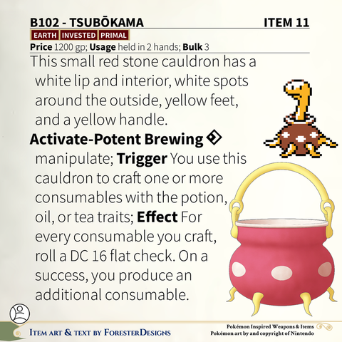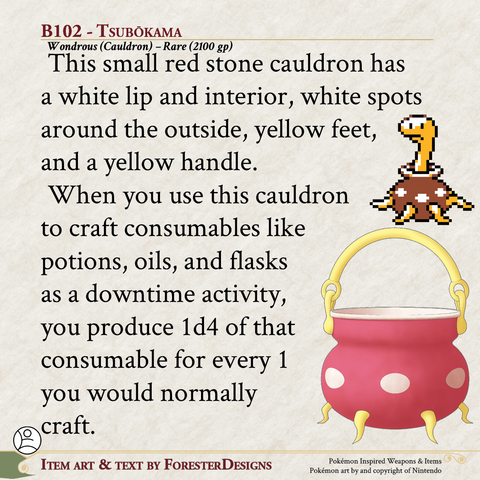 My #TTRPG #Pokemon #MagicItem of the Day in both #DnD and #PF2e, with a #Tsubotsubo (a Beta #Shuckle) #cauldron to help you brew!