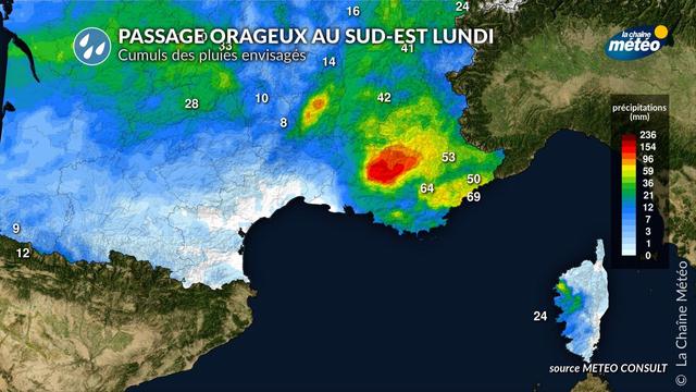 ⚠️💦⚡️De fortes #pluies orageuses sont attendues lundi des #Alpes aux #Cévennes à la Provence Côte d'Azur. Cette dégradation est sous surveillance en raison des importants cumuls attendus (20 à 60 mm, jusqu'à 100 mm) avec des risques ponctuels d'#inondations.