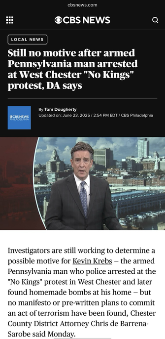 #KYW, #CBSPhiladelphia (June 23rd, 2025): https://www.cbsnews.com/philadelphia/news/kevin-krebs-malvern-no-kings-protest-arrest-press-conference