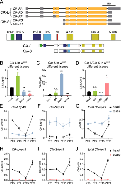 Circadian rhythms, conserved across life, are governed by molecular feedback loops in Drosophila clock neurons, though how these loops adapt in peripheral tissue clocks remains unclear. In this study, we discovered that in reproductive tissues, the expression profile of Clock is notably different. It is expressed at very low levels in the ovary, while a shorter isoform of Clock is particularly abundant in the testis. Downregulation of these isoforms impaired fertility in both male and female flies. The short isoform of CLOCK inhibited the binding of the longer isoform to CYCLE, leading to a reduction in CLOCK / CYCLE co-binding in the testis. Using ChIP-seq to identify CLOCK and CYCLE binding sites in the head, ovary and testis, we found that the binding profile of CLOCK / CYCLE was distinct between these tissues, in which CLOCK / CYCLE targets to genes involve in spermatogenesis specifically in testes. Immunostaining revealed knock down of CLOCK short form results in defects in spermatogenesis. This study reveals the expression profiles and functional mechanisms of specific Clock isoforms in reproductive tissues, which highlighted the modification of clock regulatory loop and essential role of Clock in reproductive organs.