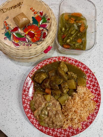 Puerco en chile verde, frijoles con tomatillos, arroz, tortillas hechas a mano, chiles en vinagre 💜🇲🇽🇲🇽🇲🇽🇲🇽