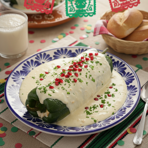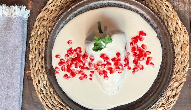 • Cubrir con la salsa de nogada y adornar con semillas de granada y perejil fresco.