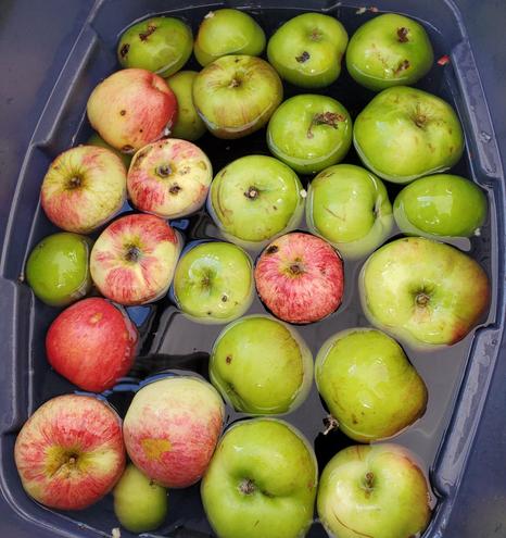 A bin full of B-grade, community gleaned apples, washed in water - to be juiced.