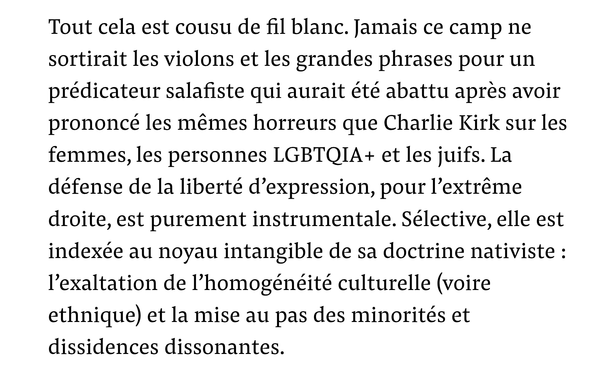 Non,#JeNeSuisPasCharlieKirk. L'extrême-droite et ses idiots utiles ne défendent pas LA #LibertéDExpression, mais uniquement une version exclusive aux élites blanches et dépolitisée de celle-ci, ce qui leur permet de faire totalement l'impasse non seulement sur ses limites (comme pour toute liberté), mais aussi sur les responsabilités qui l'accompagnent.
