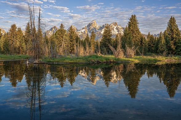 The snow-capped Grand Tetons and the cloudy sky reflect in the stream in the foreground. The stream is line with evergreens and also by a tall dead tree. At Schwabacher's Landing in Grand Teton NP Wyoming.