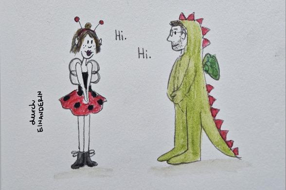 Wie es der Zufall so wollte, liefen sich Anthra Zit und der Unbekannte aus dem Kostümladen an Halloween über den Weg. Sie sagten beide "Hi." und lächelten sich still an.