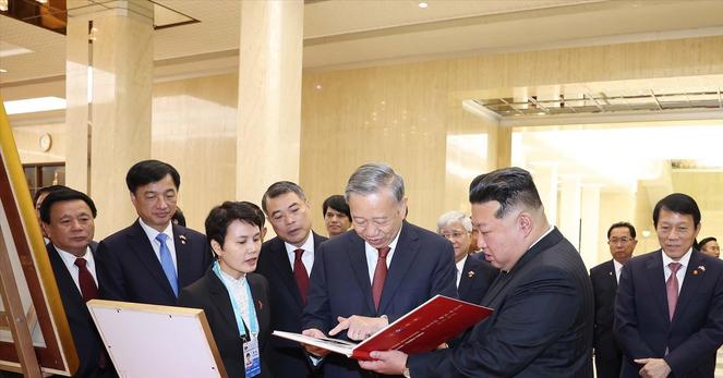 Tổng Bí thư Tô Lâm đã tặng nhà lãnh đạo Triều Tiên Kim Jong Un cuốn sách về tình hữu nghị trong chuyến thăm làm việc tại Bình Nhưỡng hôm nay. Cuộc gặp diễn ra tại Trụ sở Trung ương Đảng Lao động Triều Tiên sau lễ đón chính thức. #NgoạiGiao #ViệtNam #TriềuTiên #QuanHệĐốiNgoại #Diplomacy #Vietnam #NorthKorea #ForeignRelations