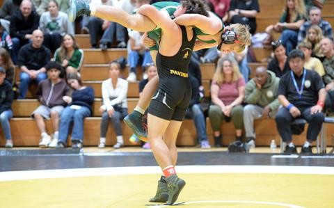 Sophomores Christian Luckey of Kadena and Josh Cope of Kubasaki wrestle at 139 pounds. (Dave Ornauer/Stars and Stripes) KADENA AIR BASE, Okinawa – One …
