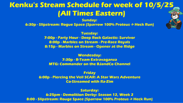 #Twitch #StreamingThisWeek #Slipstreamrrougespace #Space #Furry #Scifi #shipbattles #Adventure #Roguelike #Marblesonstream #Marbles #Racing #Simulation #MSLA #DamageOn #HeatOn #DDAM #Season12 #PartyHour #DeepRockGalacticSurvivor #Dwarves #Mining #SurvivorGame #DrillBabyDrill #MTGCommander #MagictheGathering #BJandCo #SCAR #Tabletop #RaZim #StarWars #PiercingtheVeilSCAR