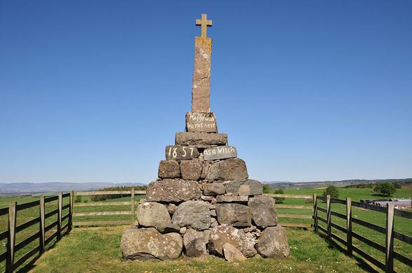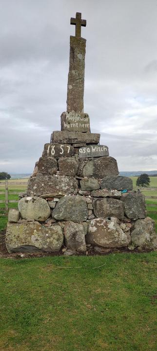 The spooky memorial near Dunning in Perthshire to Maggie Wall, "burnt here 1657 as a witch". No historical trace has ever been found of Maggie Wall, so the background to the memorial is something of a mystery. More pics and info: https://www.undiscoveredscotland.co.uk/dunning/maggiewall/index.html