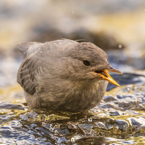 An American dipper with a tasty morsel in the Yellowstone River, Yellowstone National Park, Wyoming.