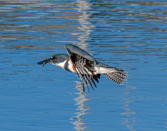 here again, and the Belted Kingfisher flying back up to its perch with a catch. Different dive.