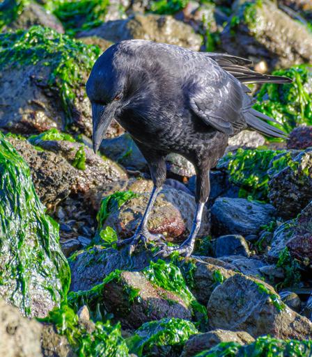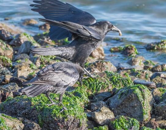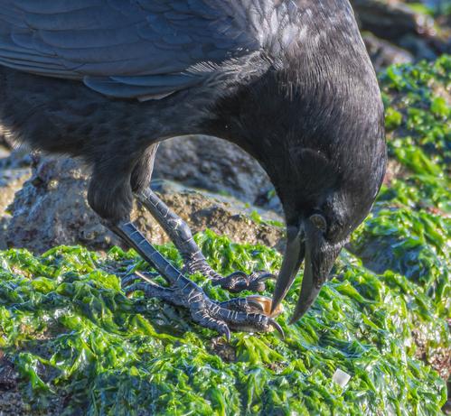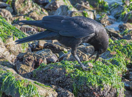 The American Crows have been watching the Black Oystercatchers and have learned their lessons well. Clams for tea!