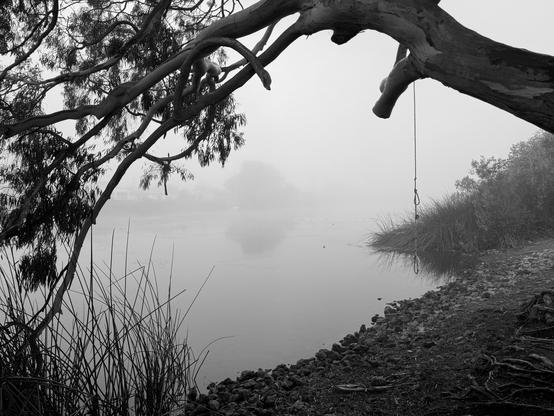 Laguna Lake in the morning fog. Someone hung the rope from the tree some time ago, and there it remains. 🤷🏼♀️