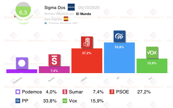 #España 🇪🇸 - encuesta Sigma Dos (5Oct): 𝗩𝗼𝘅 🥦 𝗮𝗿𝗿𝗲𝗯𝗮𝘁𝗮 𝘂𝗻 𝗺𝗶𝗹𝗹𝗼́𝗻 𝗱𝗲 𝘃𝗼𝘁𝗼𝘀 𝗮𝗹 𝗣𝗣 💧