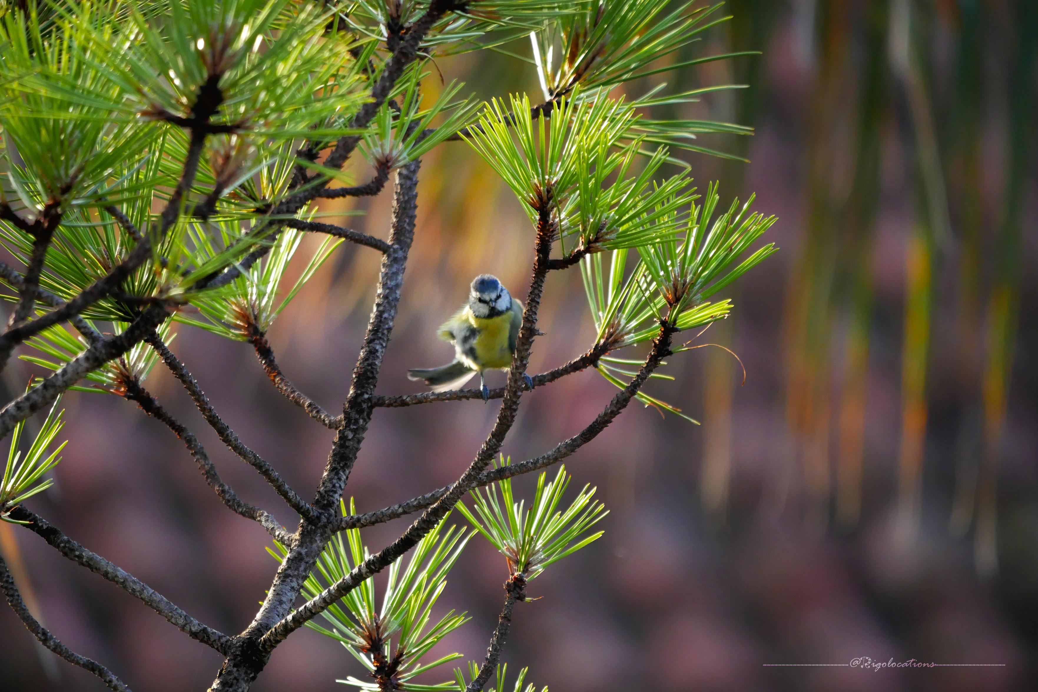 The Eurasian Blue Tit returned in later moments, sometimes pausing to watch me, sometimes diving from the tree canopy with wings spread wide, briefly illuminated by the rising sun—a small flash of living color against the still-waking world.