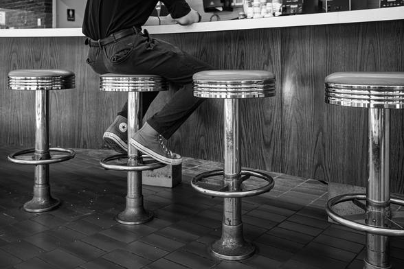 #blackandwhitephotography #blackandwhite #monochrome #diner #streetphotography #photography #candid #americana #counter #stool #chrome #sneakers #lonely #everydaylife #composition #repetition #bnw #vintage #retro
