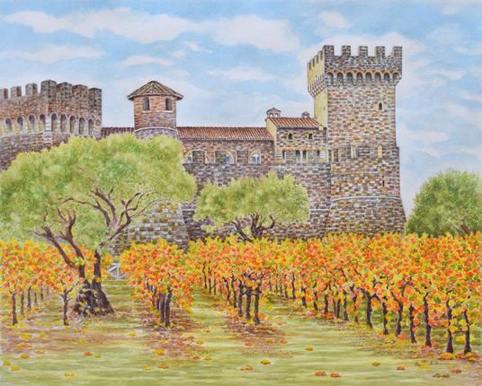 Castello di Amorosa in Autumn 🍂 My new watercolor painting inspired by a visit to this amazing winery in Calistoga, California. It was a wonderful day with vibrant #fallcolors. My 20x24 framed original is available at Moraga Art Gallery. #BayArea art lovers, come see our new exhibit which opens today! Nov. 12 - Jan. 9. Info ➡️ https://moragaartgallery.com